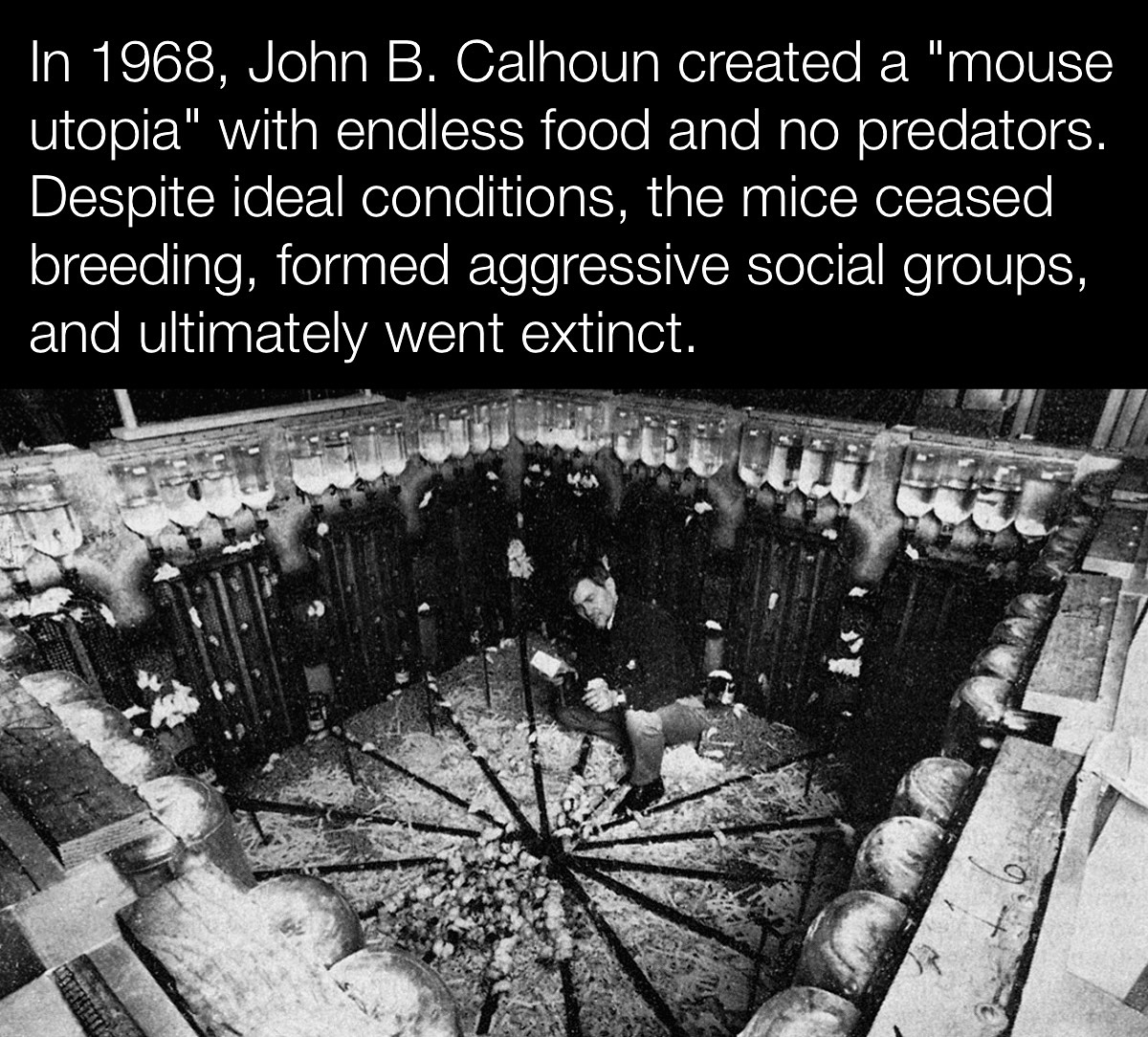 >>526361684Read the whole Universe 25 experiment instead of posting bullshit,"the Beautiful" ones returned to normal within a single generation of returning to normalcy plus their was still a breeding mouse population that mated without courtship.It was in no way heading towards extinction that part was made up in 2011 when the Cabinet Magazine published a sensationalized version of the experiments results.