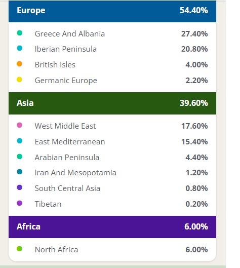 >>526362493Kind of Turkish. Here is my dad's deep dive. He is Euro but has heavy Bene Anusim. I also have grandparent from the Palestine mandate.
