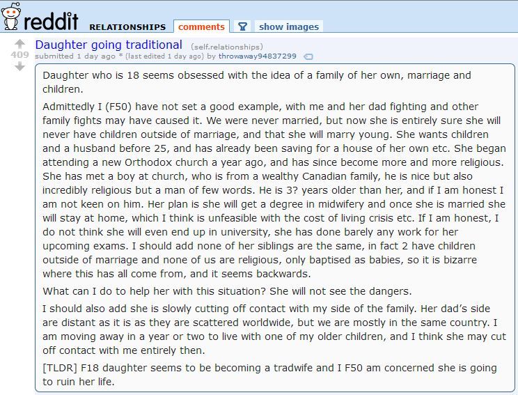 >>526366626>18 year old girl wins lottery ticket to be stay-at home wife of millionaire bachelor >"I am deeply concerned she is going to ruin her life ..."Women are so fucking evil and so quick to undercut each other at the first opportunity. Such vile, nasty whores. They should be married off at 14 or 16 so they retain their innocence under male tutelage.