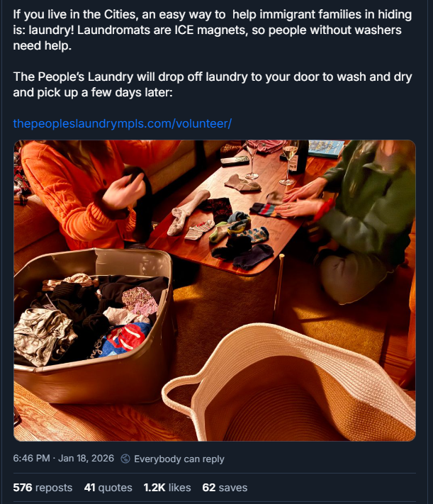 >>526364200>Women will literally do immigrants laundry for them.It's more about people helping prevent immigrants from being rounded up in raids than about women having some nurturing desire to do laundry for migrants.Your headline is misleading.