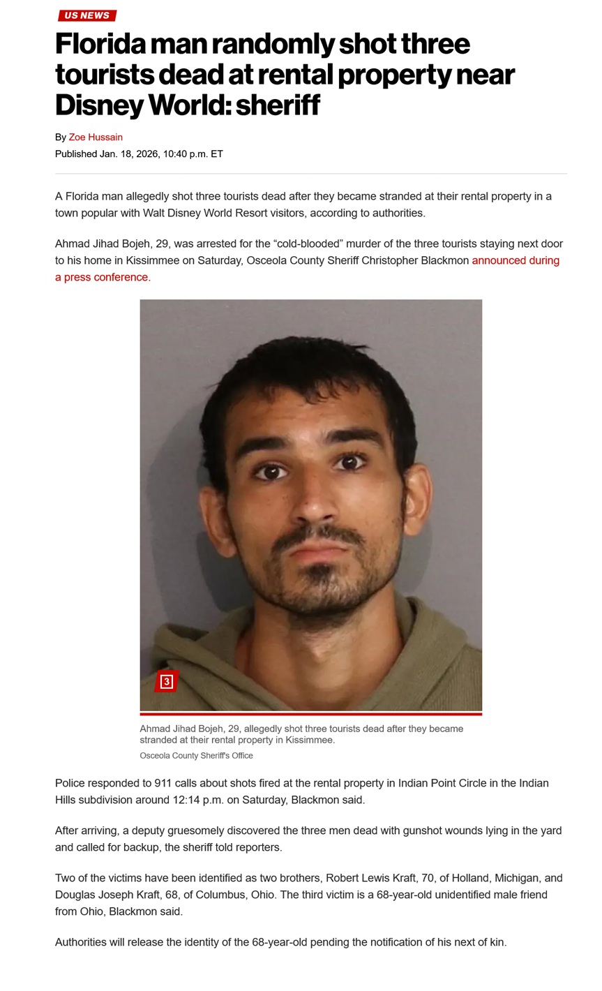 Florida continues to suffer from a string of completely random murders which began last month and which include the stabbing of an elderly woman at a Barnes & Noble store and the random shooting of a man working in his garden in Ocala. Now, a triple-murder near Disney World.The victims in all of these cases are white, the perps in every case are nonwhite. What the fuck is happening in Florida? Why are Floridians (particularly white ones) okay with this state of affairs?
