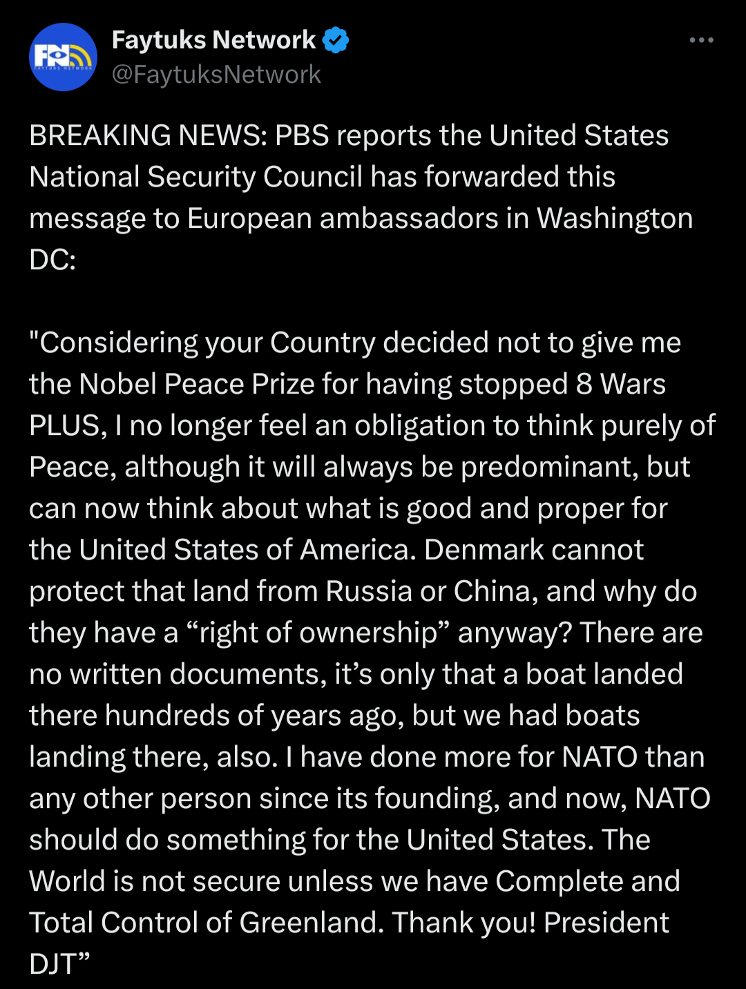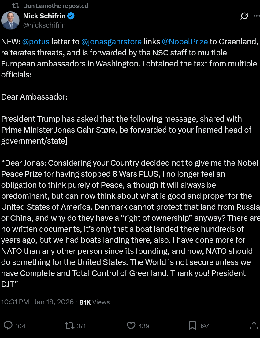 Nobel and Greenland really blowing up in the news nowSurely there must have been a dozen aides trying to stop him from sending the letter, but clearly they have zero control over him. >I no get Nobel, I maybe then war EuropeThis is not healthy. No "art of the deal" blustering covers this. This is just non compos mentis.