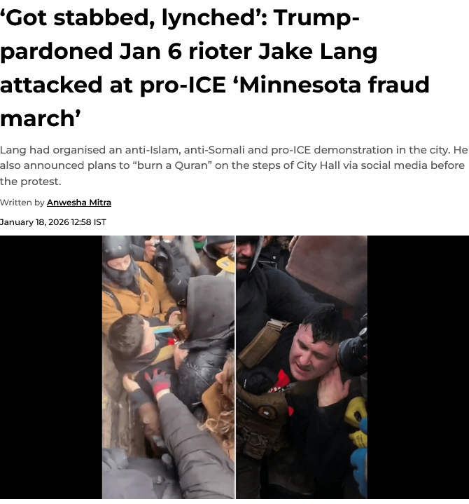 >Lang had organised an anti-Islam, anti-Somali and pro-ICE demonstration in the city. He also announced plans to “burn a Quran” on the steps of City Hall via social media before the protest.>Protests have raged across Democrat-run Minnesota over the past month — taking a significantly violent turn following the death of Renee Good on January 7. Thousands of gun-toting federal officials now roam the streets in tactical gear while protesters raise vehement objections and clash with officials. https://www.financialexpress.com/world-news/us-news/got-stabbed-lynched-trump-pardoned-jan-6-rioter-jake-lang-attacked-at-pro-ice-minnesota-fraud-march/4111346/