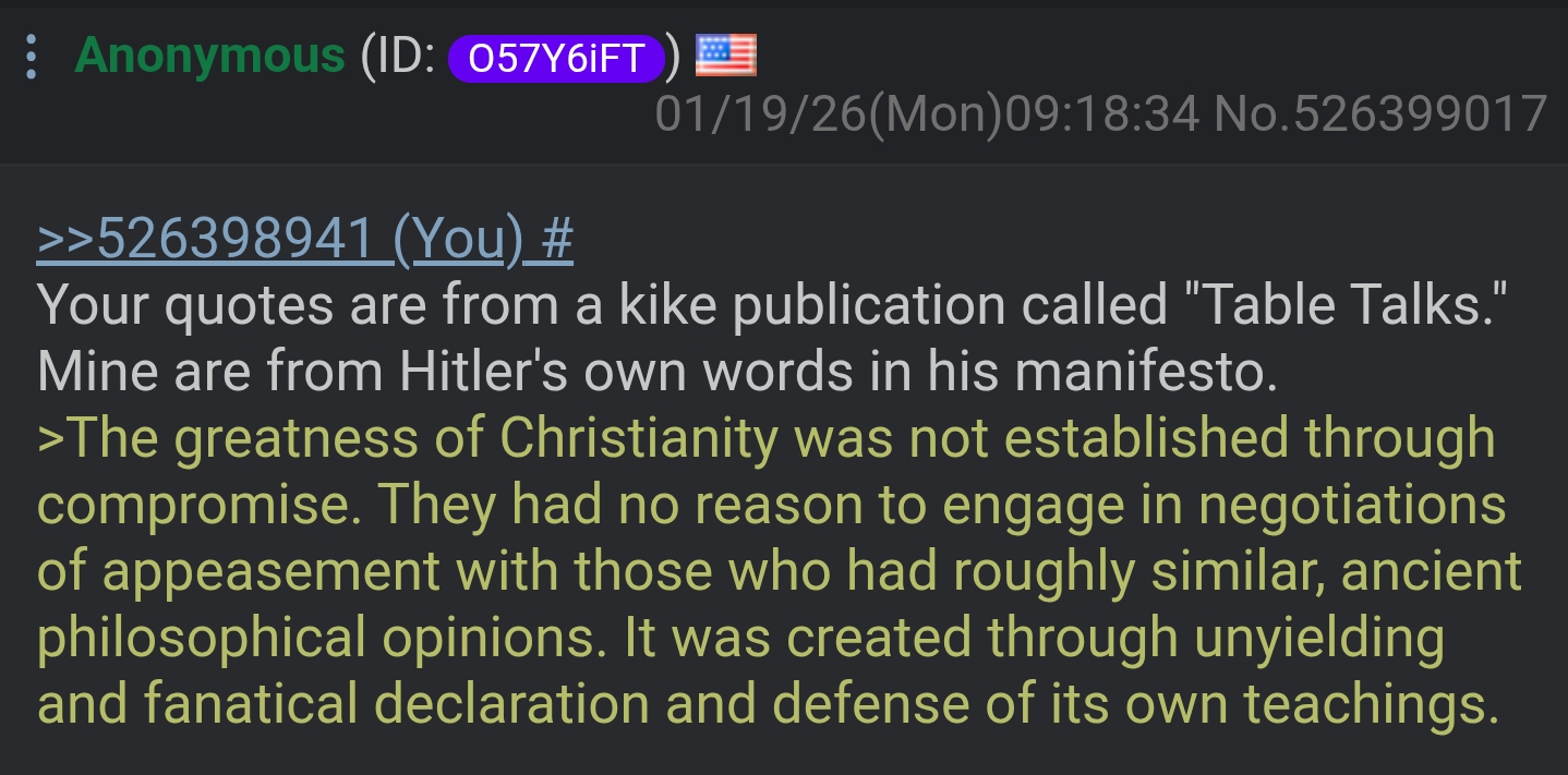 >>526398941Your quotes are from a kike publication called "Table Talks." Mine are from Hitler's own words in his manifesto.>The greatness of Christianity was not established through compromise. They had no reason to engage in negotiations of appeasement with those who had roughly similar, ancient philosophical opinions. It was created through unyielding and fanatical declaration and defense of its own teachings.