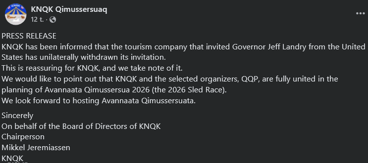 >The Avannaata Qimussersua dog sled race is the official national championship for dog sled drivers in Greenland.>Kristian Jeremiassen, who runs the tourism company Experience Qasigiannguit, told KNR that it was he who had invited Landry to the race.>"We are working to promote our tourism company, and it has nothing to do with politics or anything else.">KNQK had criticized Landry's invitation to the race and described Landry's possible participation as inappropriate. Therefore, they wanted to find out who had invited him.>"The board of KNQK finds it unacceptable that political pressure is being exerted from outside.">Landry said in an interview with Fox News that he planned to visit Greenland in March. Greenlandic member of parliament Aaja Chemnitz confirmed Landry's visit to Greenland and also to the dog sled race.
