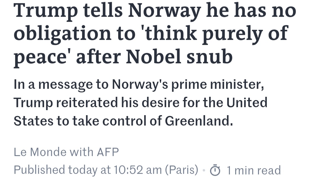 >you didn't give me the Nobel prize, that's why I will invade a country!Why does Trump behave like a 5 year old who got his toys taken away?https://www.lemonde.fr/en/international/article/2026/01/19/trump-tells-norway-he-has-no-obligation-to-think-purely-of-peace-after-nobel-snub_6749567_4.html