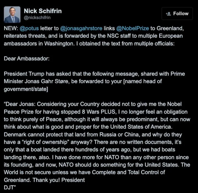 He's losing it with this Greenland shit. It's so obvious it's not for security. It's mainly for bragging rights and also a possible ressource grab. Also the last letter is just deranged. The most powerful man in the world writing like a high schooler and mad he didn't get the prize... pathetic. The man is also full of shit; if you're American and you support this Greenland shit, you're just a gullible idiot that believes all his false statements and BS.