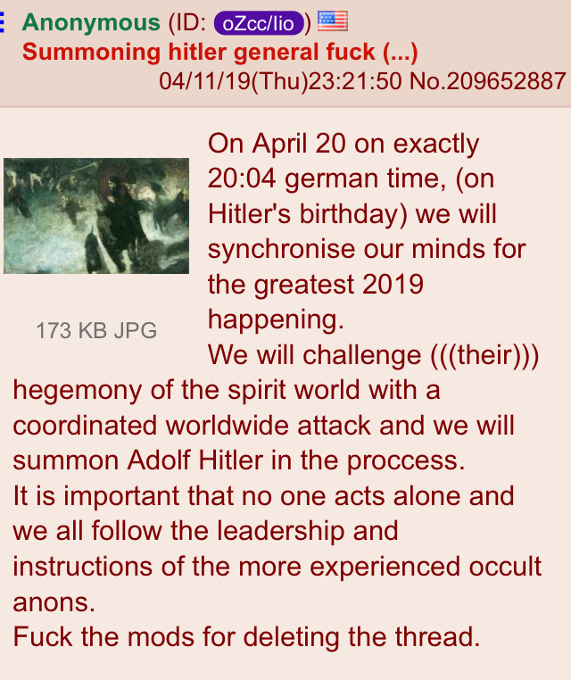 >>526433736>>526437878A female deity? Are you mad? No female deity has a good track record, neither do groups that worshipped them.No, we need some male or neutral entity. Preferably an ancient, established one. Kek was an incredible fit, almost as if it manifested itself to us here, setting the stage for its appearance for years before fitting perfectly into the mold that it made (frog, digits, chaotic nature of the site for a chaos god etc). There have been many flops with artificially created characters, like Winter-chan or that Scottish girl with an axe, for example, because we cannot create a new entity, though I might have expressed myself awkwardly earlier.We need to find out which entity (or an aspect of the One) we should feed.Especially unwise are female characters, because they receive energy usually through face-value lust which is absolutely incompatible with higher goals and has a great potential to backfire in case the character is an actual manifestation as opposed to, you know, just a drawing. It will blow up and fizzle out quickly, leaving no trace in mere weeks, it has no potential in the long run.Granted, digits are not exclusive to Kek. They can be used for many things. As we are seeing now, maybe a chaos god isn't really a wise choice, assuming the scenario in which we are really in control in the situation.