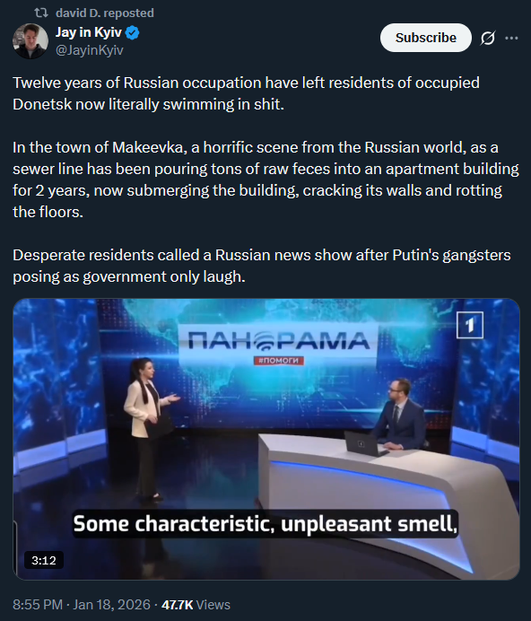 >Twelve years of Russian occupation have left residents of occupied Donetsk now literally swimming in shit.>In the town of Makeevka, a horrific scene from the Russian world, as a sewer line has been pouring tons of raw feces into an apartment building for 2 years, now submerging the building, cracking its walls and rotting the floors.>Desperate residents called a Russian news show after Putin's gangsters posing as government only laugh.