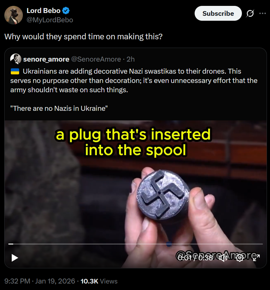 >Ukrainians are adding decorative Nazi swastikas to their drones. This serves no purpose other than decoration; it's even unnecessary effort that the army shouldn't waste on such things.damn nazis