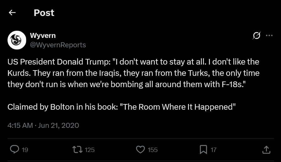 >>526428555much of the geopolitical edifice consisted of paper tigers that had extremely shaky foundationsthe moment you had even remotely competent plans they fell apart.the SDF for instance was a one party semi authoritarian kurdish state yet like 2/3 or more of its territory was inhabited by ethnic arabs. it was one thing when their opponents were the hated assad regime or jihadists but when you have an at least nominally moderate government in damascus uniting the rest of the country shit was bound to fall apart. they never bothered to truly get the loyalty of their arab citizens and now they're reduced back to a kurdish separatist group that overplayed its hand and is getting btfo because washington knows they've outlived their usefulness
