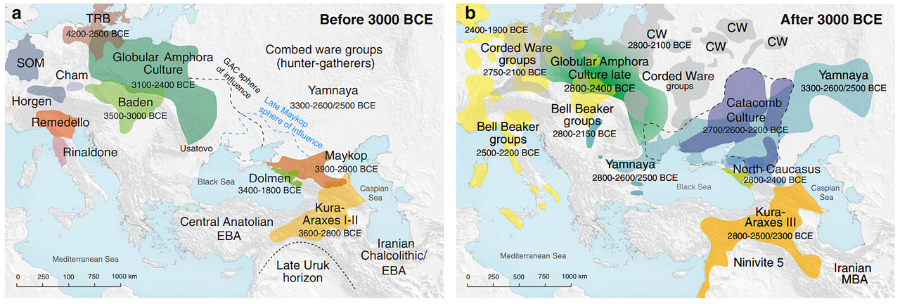 >The Kura–Araxes culture (also named Kur–Araz culture, Mtkvari–Araxes culture, Early Transcaucasian culture, Shengavitian culture) was an archaeological culture that existed from about 4000 BC until about 2000 BC, which has traditionally been regarded as the date of its end; in some locations it may have disappeared as early as 2600 or 2700 BC. The earliest evidence for this culture is found on the Ararat plain; it spread north in the Caucasus by 3000 >Ancient DNA analysis has provided insights into the genetic composition of individuals associated with the Kura-Araxes culture. The Y-chromosome haplogroups identified in Kura–Araxes individuals include G2b, J-CTS1460 (x2), J-Z1842, and R1b1-M415 (xM269), reflecting a mixture of lineages with deep Near Eastern and Caucasian origins. Mitochondrial DNA (mtDNA) analysis indicates diverse maternal lineages, with haplogroups including H, H1u, K3, N1b1a, R1a1, T2a1b2b, T2h, U1a1a, U3a2, U3b1a1, U3b2, and X2f. These haplogroups suggest genetic connections between Kura–Araxes populations and neighboring regions such as Anatolia, the Near East, and the Caucasus. Genomic studies indicate that Kura–Araxes individuals shared a significant portion of their ancestry with Caucasus hunter-gatherers (CHG) and Anatolian Chalcolithic populations. The data indicate a largely stable genetic profile over time, with limited gene flow from Steppe populations, distinguishing them from later Bronze Age groups that incorporated more Yamnaya-related ancestry>It is often assumed that the Hurro-Urartian languages, or a pre-split Proto-Hurro-Urartian language, were originally spoken by people of the Kura-Araxes culture which existed in Eastern Anatolia, the Caucasus, northwestern Iran, Upper Mesopotamia and northern Levant from the late 5th millennium BC to late 3rd millennium BC