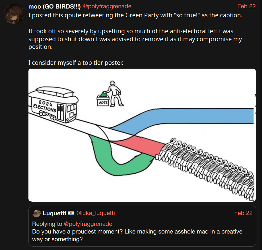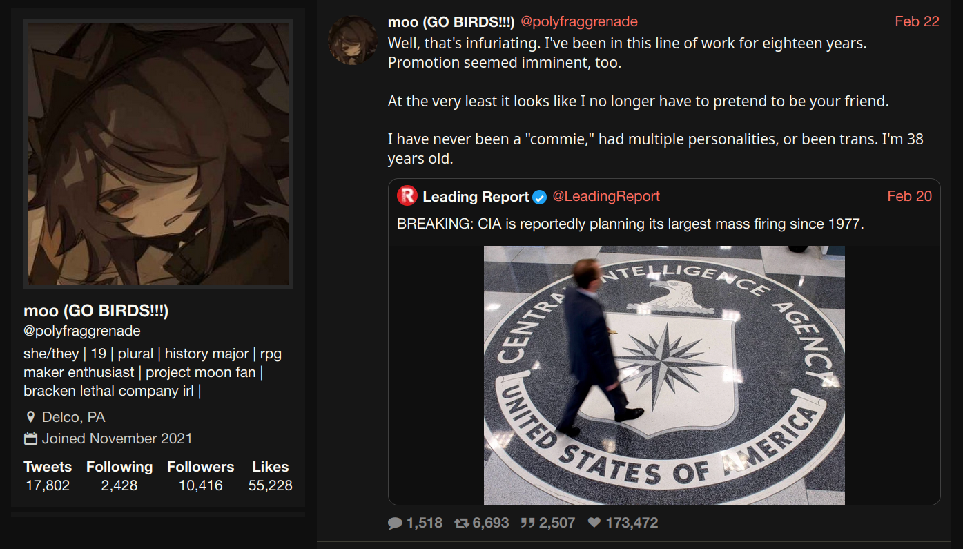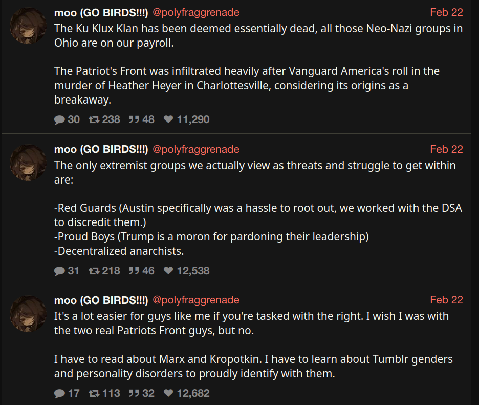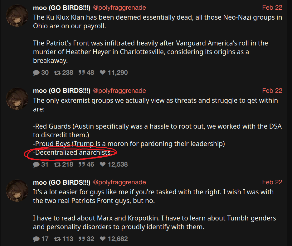 This kind of shit is awesome as a counter tactic because it makes the left, which is already prone to purity spirals, even more paranoid that one of their "comrades" is a fed. Sows mistrust and makes everybody suspect each other.