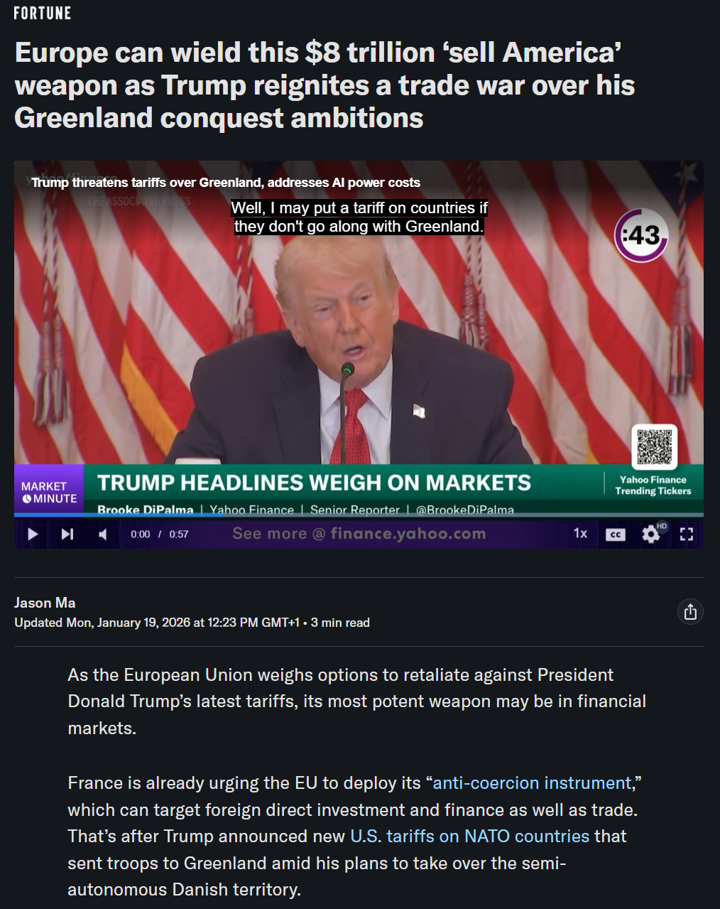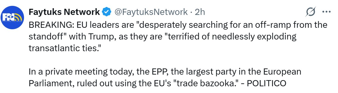 >>526445566Wow. That didn't last long, did it? lol>BRUSSELS — Donald Trump's address to the World Economic Forum in Davos on Wednesday will help determine the tone of Europe's response to the U.S. president's tariff threats as leaders desperately search for an off-ramp from the standoff.>European governments are holding out hope they can lower the temperature and get Trump to abandon his vow to slap punitive tariffs on European countries that have opposed the sale of Greenland to the U.S. POLITICO spoke to 11 diplomats and two EU officials, all of whom said they want to avoid retaliation and are betting that a diplomatic solution to the crisis can still be found.>"The focus is getting the ball rolling in Davos. Then, we will take stock" at an emergency EU leaders' summit convened for Thursday, said one EU diplomat. "The pressure needs to come down."...>All the diplomats and EU officials POLITICO spoke with cautioned that it was too early to threaten to deploy the EU's Anti-Coercion Instrument, or "trade bazooka," an idea being championed by French President Emmanuel Macron.>Wielding the instrument — an all-purpose tool meant to deter other countries from using trade tactics to extort concessions in other areas — still faces significant opposition.>The leader of the EU's biggest political force, the European People's Party group, said at an internal meeting on Monday that the option should be off the table and that the EU must be tough with the Americans in private but deescalate in public, according to two people in the room. German Foreign Minister Johann Wadephul and his Italian counterpart Antonio Tajani took a similar line at the same meeting.>"We need to be very moderate because our goal is not to fight with the Americans. Our goal is to strengthen our economies." Tajani told POLITICO. "We want to talk" with the Americans.https://archive.ph/L5eJ5