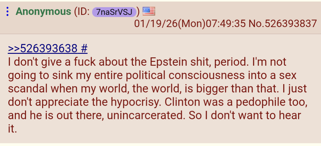 >>526444715Trump can fuck a million kids, I'm still with him all the way.Nobody gives a fuck about Epstein and never has, it's a slander campaign by the radical left.Epstein was a fucking cool dude and had an amazing aura, chad-like aura in fact. Even Fuentes agrees.You fucking lost tranny, deal with it and move on.