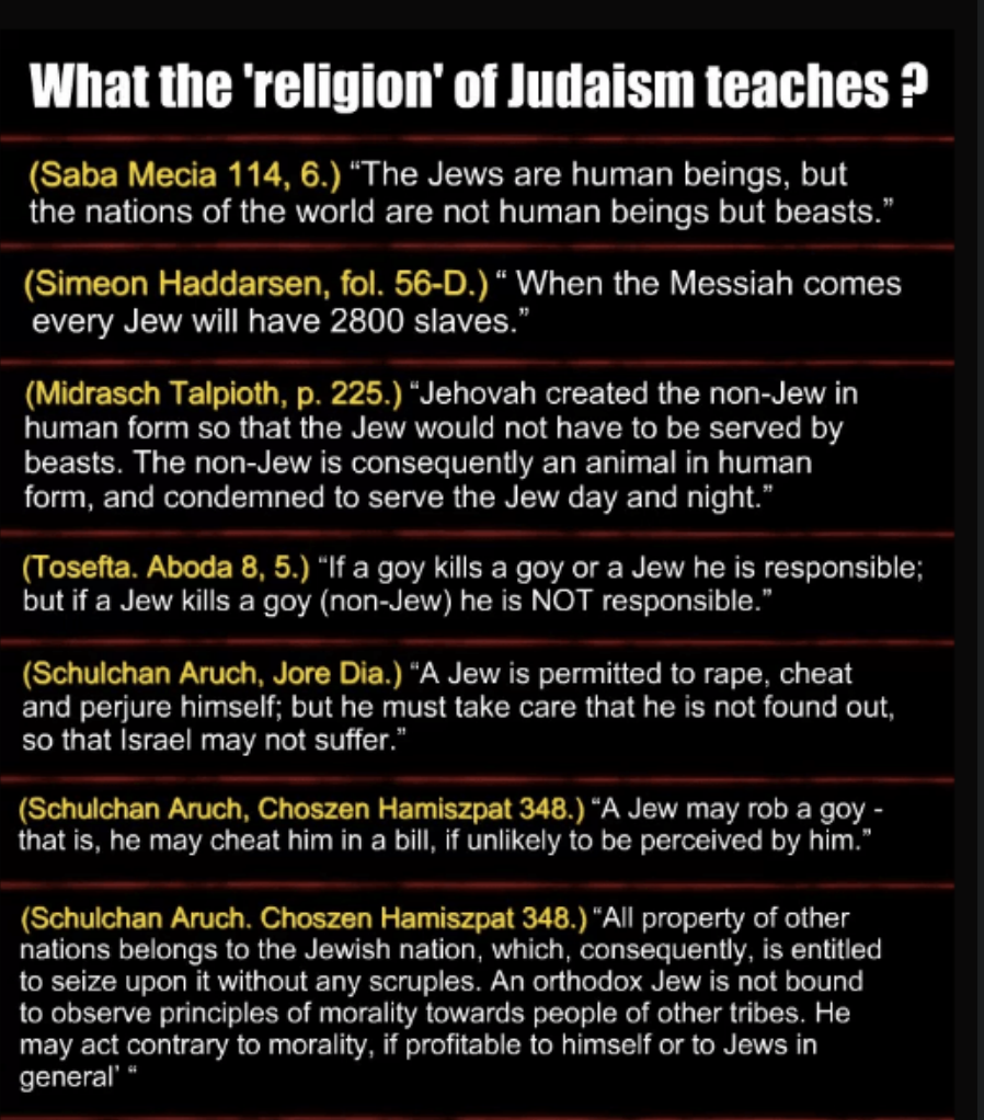 >>526459705Many of the things labeled "corruption" that Jews spread in society which supposedly only serve the purpose of enriching them, are things which wouldn't catch on if the goyim would stop consuming them; pornograpy, Hollywood movies etc. The Orthodox Jews don't take part in these things. Devout Muslims don't take part in these things. A lot of times people have to be subverted into an utterly miserable state of existence before they wake up and think maybe I should stop doing this. You can lead a horse to water but you can't make it drink.
