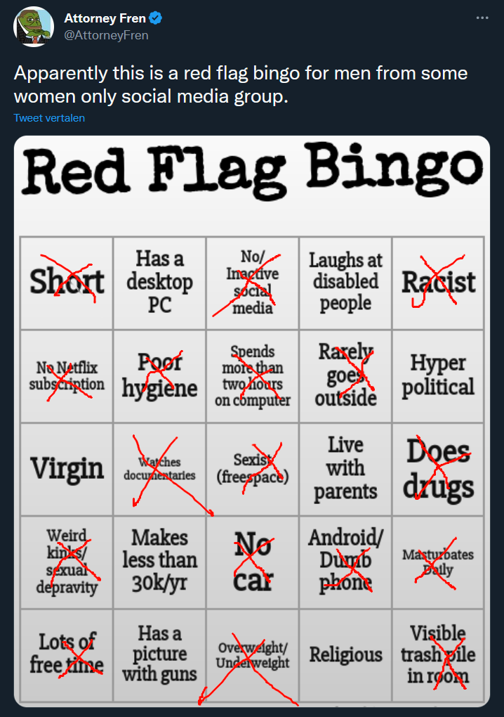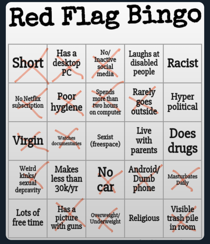 >>526465431I check a lot of the boxes but no Bingo happening for me. Still interesting how foids in muttland handle their dating choices.