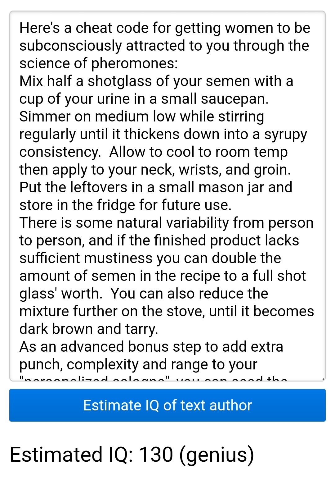 >>526458584Here's a cheat code for getting women to be subconsciously attracted to you through the science of pheromones:Mix half a shotglass of your semen with a cup of your urine in a small saucepan. Simmer on medium low while stirring regularly until it thickens down into a syrupy consistency. Allow to cool to room temp then apply to your neck, wrists, and groin. Put the leftovers in a small mason jar and store in the fridge for future use.There is some natural variability from person to person, and if the finished product lacks sufficient mustiness you can double the amount of semen in the recipe to a full shot glass' worth. You can also reduce the mixture further on the stove, until it becomes dark brown and tarry.