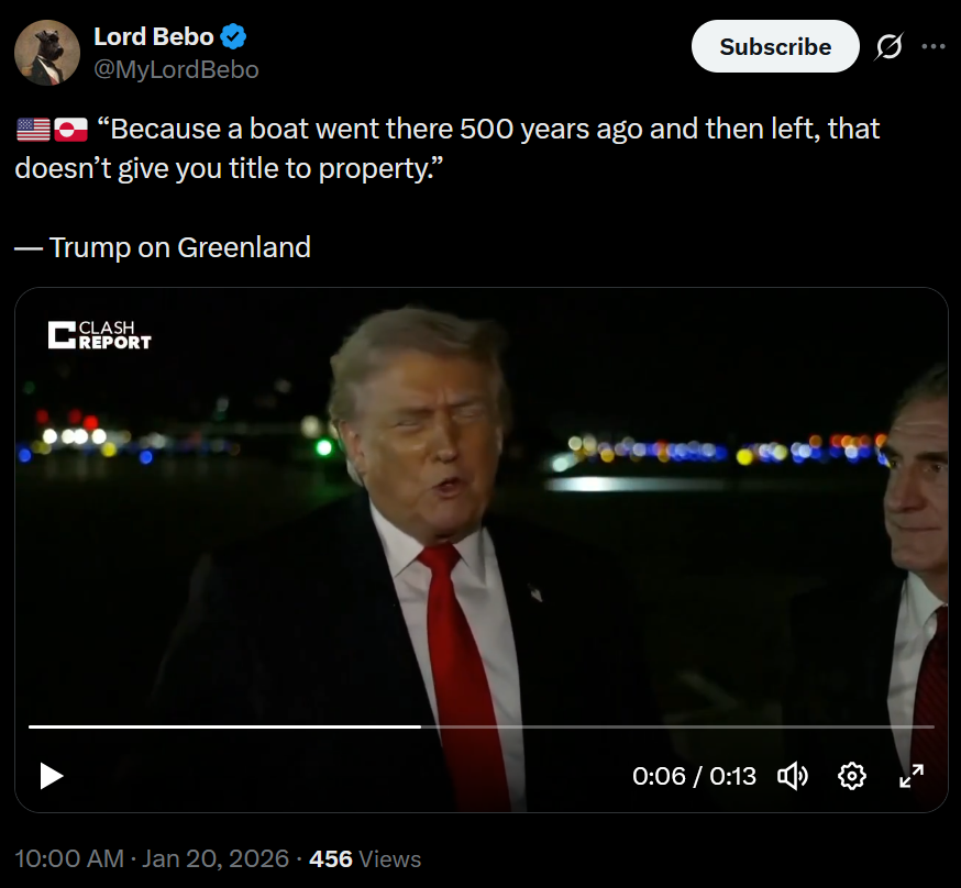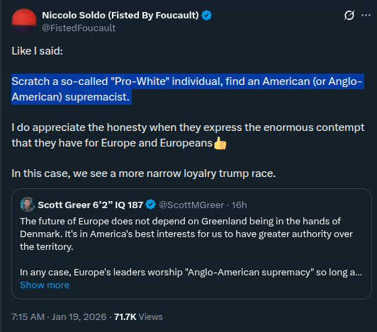 >>526465016>Trump is literally trying to control land GAE already control, maybe with the purpose of sour relations and make the US look bad on purpose.He seems to just despise Europe (and Europes liberal leadership class) while being set on entering the history books (which a massive land grab inevitably would do).The problem for the EU is that every leader in the world despises the EU leaders and nobody takes the union seriously nor trust them.Remember that these are the people who for years mocked Trump and even meddled in the US election to get Biden and Kamala.So for Trump, they are weak, annoying and treaterous leeches living off US military protection without which they would be nothing. Greenland in that context is even more American than the unprotected oil fields in Syria (controlled by SDF/Shell, so UK, which he now used HTS/Al Nusra to transfer to Chevron).Venezuela is a good example of what he feels entitled to do because some leader sits on gold, is weak and is on his naughty list (which all but two EU leaders are).NATO btw is just the US and "freeloaders" (which is by american design, Trump doesn't care). So it is even possible that Trump sees Greenland not only as a snub but also as a legitimate payment for US protection, despite how deranged the logic is.And I think that if he and others in congress believes the latter, then Greenland is inevitable.