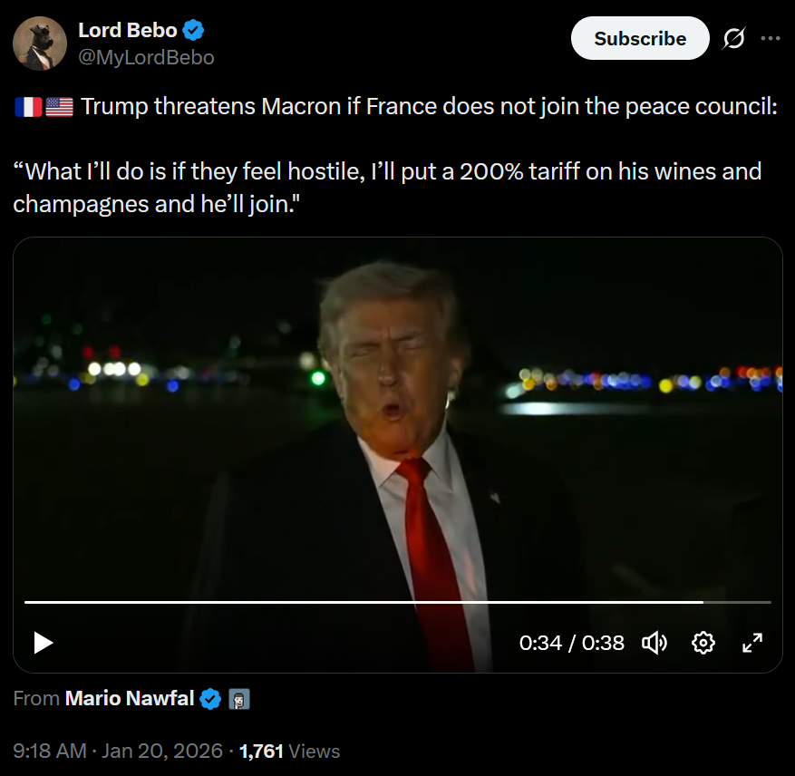 >Trump threatens Macron if France does not join the peace council: >“What I’ll do is if they feel hostile, I’ll put a 200% tariff on his wines and champagnes and he’ll join."LÖL
