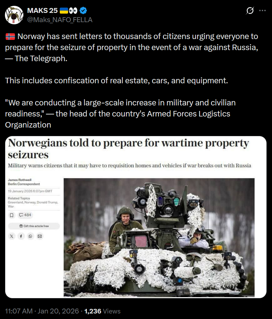 >Norway has sent letters to thousands of citizens urging everyone to prepare for the seizure of property in the event of a war against Russia, — The Telegraph. >This includes confiscation of real estate, cars, and equipment.>"We are conducting a large-scale increase in military and civilian readiness," — the head of the country's Armed Forces Logistics Organizationpathetic fearmonglering again
