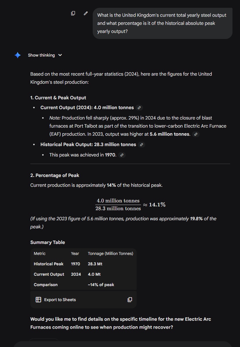 >>526467983>It was the largest empire in human history and consisted of a fourth of humanity. It had more tonnage in the sea than everyone else combined just 100 years ago.Now they can't even make ships, steel or even English babies anymore. Capitalism truly is a helluva drug.>Greater than 99% drop in shipping tonnage built.>70 to 75% drop in oil production.>99.9% drop in coal production.>80% drop in steel output (2024 numbers, might be closer to 100% now)>59% drop in car production.>51% drop in cement production.