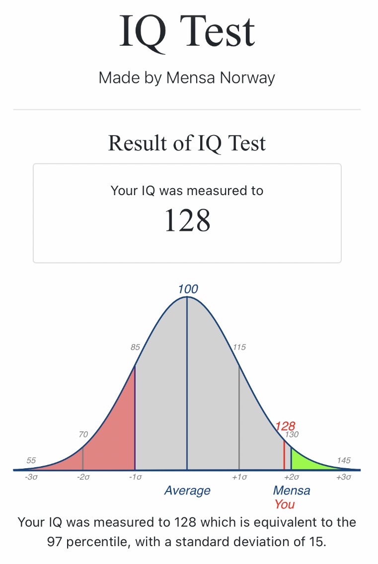 Post your IQ test scores.https://testyourself.psychtests.com/https://wonderlictestpractice.com/https://test.mensa.no/Home/Test/en-UShttps://planning.e-psychometrics.com/test/icar60https://www.test-iq.org/free-iq-test/https://www.free-iqtest.net/https://www.iqtestexperts.com/https://cognitivemetrics.com/https://www.stanfordbinettest.com/