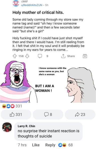 >>526471970I'm gonna be honest, I can't come to make fun of people like that. They are basically mentally ill, but a part of society decided they're not and pushes them to do this shit that will maim them for life just to profit on these operations. Imagine someone convinced a down syndrome individual to cut his fingers off just because he wants to sell bandages to him afterward. It's pure evil.