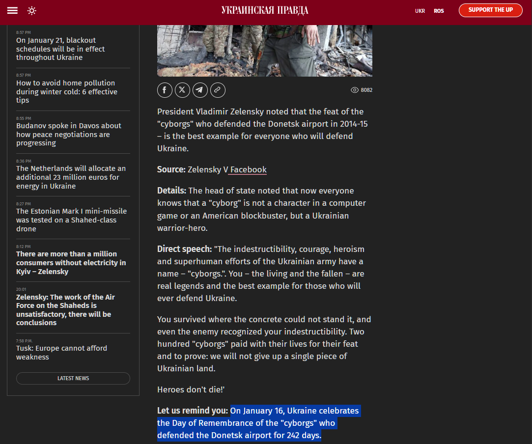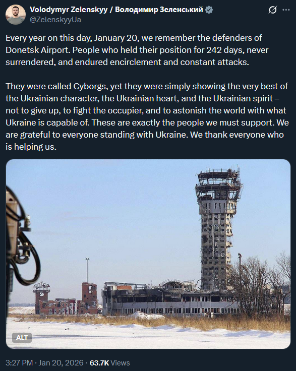 >Every year on this day, January 20, we remember the defenders of Donetsk Airport. People who held their position for 242 days, never surrendered, and endured encirclement and constant attacks.>They were called Cyborgs, yet they were simply showing the very best of the Ukraine's character, the Ukraine's heart, and the Ukraine's spirit – not to give up, to fight the occupier, and to astonish the world with what the Ukraine is capable of. These are exactly the people we must support. We are grateful to everyone standing with the Ukraine. We thank everyone who is helping us.>not to give upUntil the last Ukrainian.