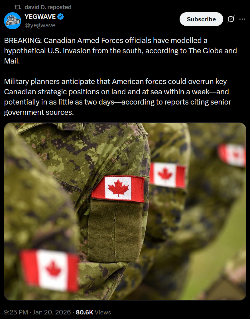 >Canadian Armed Forces officials have modelled a hypothetical U.S. invasion from the south, according to The Globe and Mail.>Military planners anticipate that American forces could overrun key Canadian strategic positions on land and at sea within a week—and potentially in as little as two days—according to reports citing senior government sources.LÖÖL