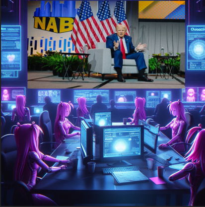 >>526511122An older male public figure sits forward in a gray armchair on a stage. Behind him, multiple American flags are arranged symmetrically. His hands are extended mid-gesture, palms open, as if emphasizing a point to a live audience. The lighting is unmistakably that of a formal public event.To the left of the stage image, large block letters are visible:>NABBold. Yellow. Unambiguous.One analyst zooms in on the flags. Another isolates the facial features. A third enhances the backdrop, tracing the typography and confirming the lettering.Data scrolls:-Facial structure comparison-Known public-event staging patterns-Flag arrangement consistency-Organizational branding matchThe room is quiet except for keystrokes. Finally, one of the analysts leans back slightly and speaks, summarizing what all of them are already seeing.>“Yep. It’s clearly the same public figure we’re thinking of — unmistakable. And it definitely says ‘NAB.’”No disagreement follows. Screens stabilize. The analysis is complete.(an AI-G production....)*-*