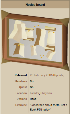 >>526513475=[SCAM NOTICE BOARD]=https://oldschool.runescape.wiki/w/Notice_board_(Bank_PIN)```https://www.reddit.com/r/osrs/comments/1h48gdy/a_scam_yes/```I began scamming players for their passwords in the early days of RuneScape and probably cleared out like 20 banks. The technique was simple social engineering: impersonate authority, speak confidently, create urgency. While a player logged out “while their account was transferred to the moderator mainframe,” I would clear their bank. It was almost always low-level or inexperienced players who fell for it.The addition of bank notice boards explicitly warning players not to share credentials reads like a direct countermeasure to this entire class of scam:>“If you’re worried about someone stealing items from your bank, why not protect yourself with a Bank PIN?”followed by the blunt admonition,>“But remember, KEEP YOUR PIN SECRET!”(Notice board (Bank PIN) transcript). What had once been an emergent, player-driven exploit hardened into official doctrine—security advice literally nailed to the walls of banks.What’s striking is how little the scam itself has changed in twenty years. The modern version—fake Player Moderator offers delivered via private message—still relies on the same cues of legitimacy and flattery. In a recent r/osrs thread documenting the scam, one commenter notes flatly:>“Remember the Stronghold of Security lads: Jagex will never contact you in game”(u/DartFeld3).Another adds historical continuity almost accidentally:>“I remember this scam 20 years ago! Nice to see they’re sticking to their roots.”(u/Early_Butterscotch54). Others point out the formal markers of real authority that scammers imitate but can’t replicate:>“What they say is true, all Jagex employee accounts will have an obvious little gold crown with an M in it in front of their names.”(u/johnnylemon95).*-*