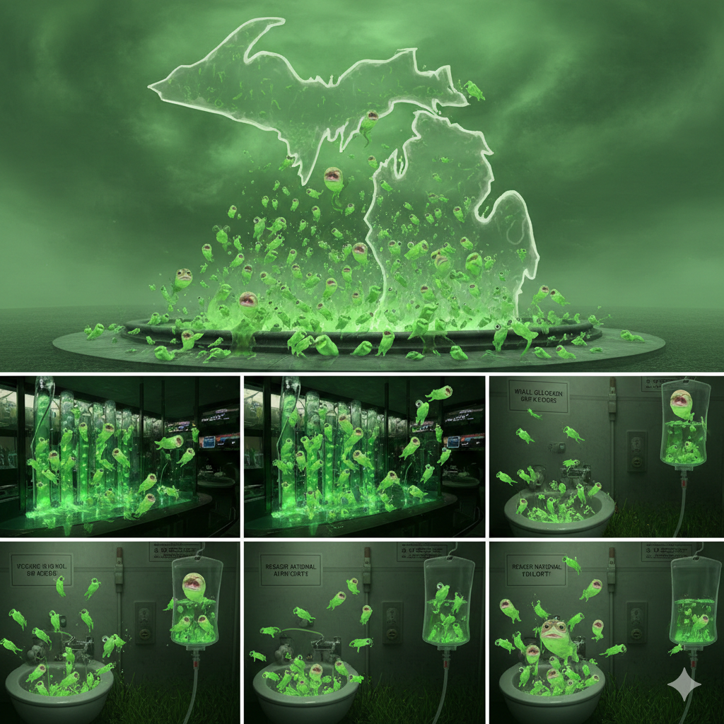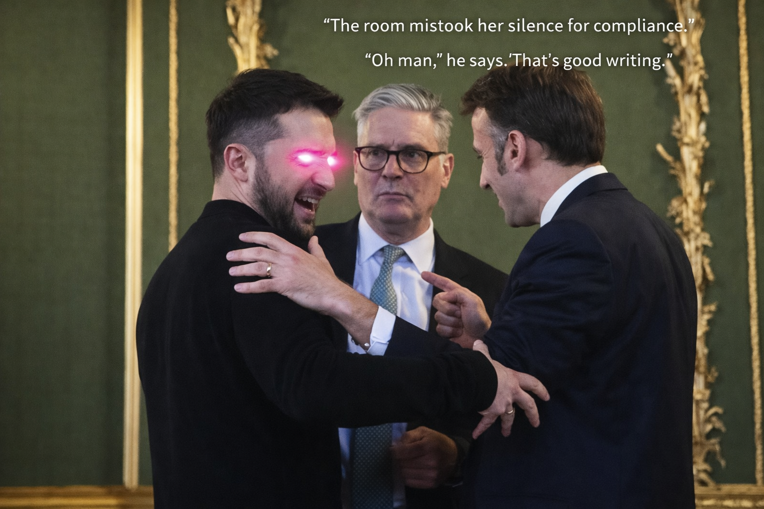 >>526523534*ZELENSKY (EVIL VERSION)*His hologram flickers more than the others, as if it’s being streamed through urgency itself.>“You understand what this means.”>“Narrative redundancy.”>Moral compression.”He nods once, sharply.>“She needs distance.”>“Distance clarifies.”*-*Obunga doesn’t look up from the readouts. He listens the way surgeons listen to machines—only the changes matter. The beatbox doesn’t stop. It mutates—a quieter tempo, airport-terminal rhythm.>*tkk—hss—bmm—tkk—*>“Australia is clean.”>“Southern Hemisphere latency.”>“Good acoustics for reframing.”He finally glances at the holograms.>“What exactly are you uploading?”*STARMER (EVIL)*>“Stability without authorship.”*MACRON (EVIL)*>"Climate without consent.”*ZELENSKY (EVIL)*>“Peace without memory.”A pause. Then, together—like a chorus trained by committees:>“Paris and Peace.”Fat Gretch flips a switch labeled SOUTHERN REORIENTATION.>“Australia’s perfect.">“Still Commonwealth-coded.”>“Feels Western.”>“Feels distant.”Baron Bernstein hums faster now, backward anthem bleeding into static.>“Out of sight.”>“Out of mind.”>“Still in network.”