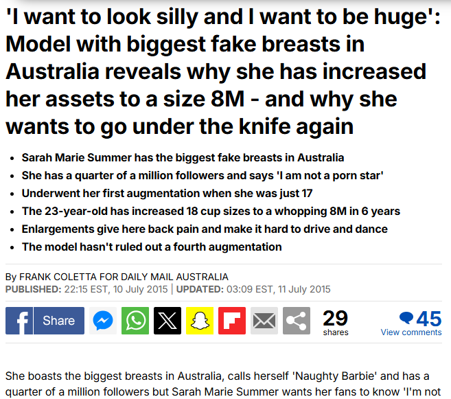 >>526523784She boasts the biggest breasts in Australia, calls herself ‘Naughty Barbie’ and has a quarter of a million followers but Sarah Marie Summer wants her fans to know ‘I'm not a porn star’. Instead, the 23-year-old from Sydney with the 8M breasts, has urged her followers to not only look but also listen, particularly to her music. Despite the critics, the busty model may yet go under the knife again. ‘I’ve been told that I apparently have issues inside my head and that my surgery is me trying to fix that,’ she said.She has had three augmentations in six years, increasing 18 cup sizes to an anatomical 8M, or as she prefers to call it ‘my sexy size’. It brings with it a massive following and no shortage of notoriety. Marie admits that she has ‘always identified as having a very sexual persona and I’ve been getting in trouble for it’ Sarah Marie Summer has hit back at her critics who've taken issue with her series of breast augmentationsThe busty model has almost a quarter of a million followers but has told them ‘I'm not a porn star’ Among the followers are those who, she claims, tell her that ‘I’m ugly, I’ve ruined myself, to commit suicide, that I am degrading to women and I am everything that is wrong with the world,’ she admitted. ‘How society has chosen to take my story disgusts me.’She has just released her new music video, “Nylon Legs”. ‘I am not a porn star. I don't admittedly bother to correct people as anyone who is following me will learn pretty fast I'm a model, singer, actress and I guess I take it as a compliment.’ The 23-year-old has also just completed her first speaking role in a movie but wouldn't reveal details. ‘This movie is still in production and I am under a confidentiality agreement to not speak about this until after release,’ she said. ‘What I can share is that it’s a romantic comedy, I had lots of fun doing it and I'm looking forward to the next project.’