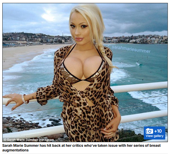 >>526523838‘I think my music is a great fit for music festivals and club performances, I have been singing my entire life. ‘I always identified as having a very sexual persona and I’ve been getting in trouble for it since back then. ‘I can’t believe even now we are in 2015 and people still identify sexuality as a sin and not a great part of life that can be used to creatively enhance art.’Sarah Marie Summer says she wants to be known for her music and movie roles but may yet undergo another breast augmentation – she has already had three in six years. Her biggest claim to fame, to date, is having Australia's biggest fake breasts but this chest-obsessed woman could defy medical advice and go under the knife a fourth time. ‘It actually wasn’t a goal,’ she said. ‘When I got them done I wasn’t even thinking about such statistics.After surgery it was pointed out to me I did probably have Australia’s largest breast implants and with the knowledge I have about plastic surgery I realised it was actually true.’ ‘I knew I’d be judged, I knew I would alienate my beauty in the eyes of some people, I’d be immediately seen as a sexual object and it would limit the acting/modeling jobs I could do. ‘I did it anyway because I knew how great it would look to me and I was more prepared to risk it all than live without doing so.’Ms Summer underwent her first surgery in New Zealand when she was just 17. It cost $13,000 and took her to a size 10C but the model wasn't satisfied and started saving for her next procedure. In July 2013, Ms Summer had her second breast augmentation and went up to a 10DD. ‘I had mixed feelings after because they were still not what I had imagined. They were just not big enough so I decided to go again,’ she said.
