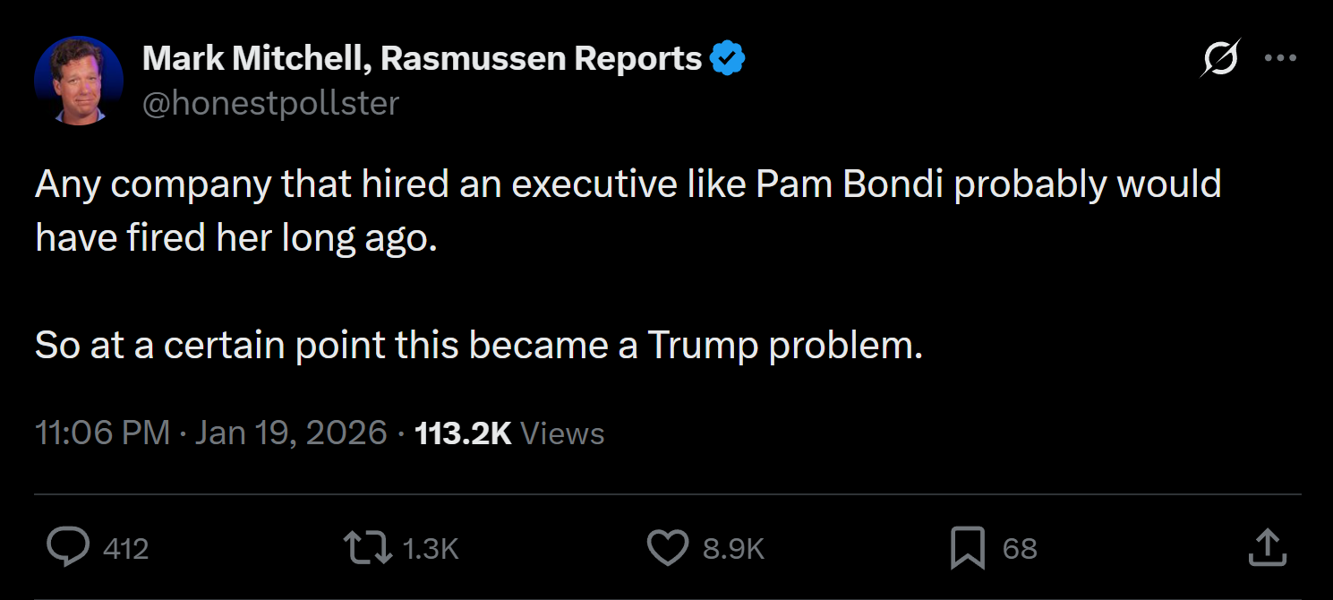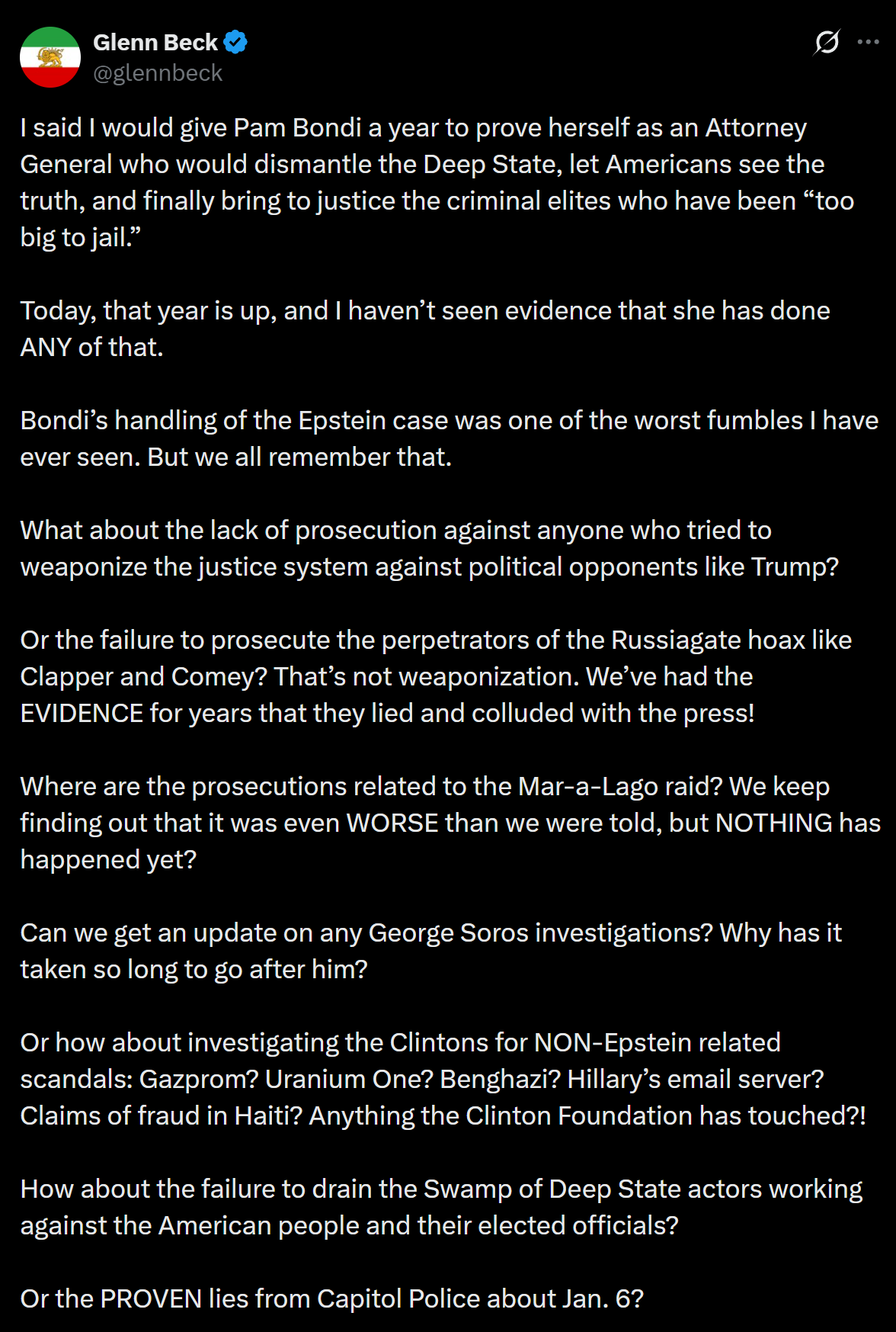 Guys it's bad. We lost Trump's strongest soldier over Bimbo Bondi. I don't think we can recover from this. It's so over. America has fallen. Millions of us will die.https://x.com/glennbeck/status/2013729996901159228