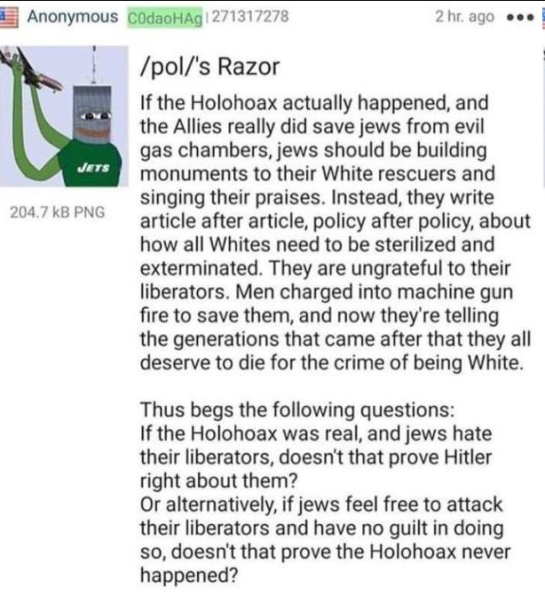 >>526522442funny that this even needs to be said atp but if it was true they wouldn't need to criminalise questioning it. if it is so well documented as they claim, it would be trivial to air it all out and use the weight of the evidence to crush and humiliate the deniers once and for all. but they don't do this. i wonder why.ah well, let's see if any faggot memeflags are brave enough to try today. show me any solid evidence that 6 million jews were gassed to death in under 4 years in morgues using pesticides.here are some examples of bad evidence:confessions of tortured enemiesblatantly fabricated or unreliable witness accountsdocuments that say nothing about mass murder or gas chambershave at it
