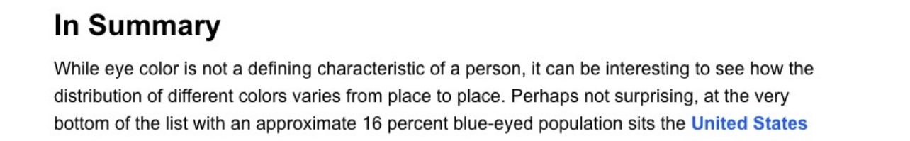 >>526536918This is just untrue and a cursory google search will tell you as much. 36% of the US gen pop has blue or green eyes, given that it’s a broad ethnic mix from across Europe, 60% white is p. reasonable. I’m really not sure why euros see fit to boast. The US at any given point is just a preview for where you’ll be in 10-20 years. You may as well try to actively avoid our mistakes instead of bragging that your ship started sinking later.