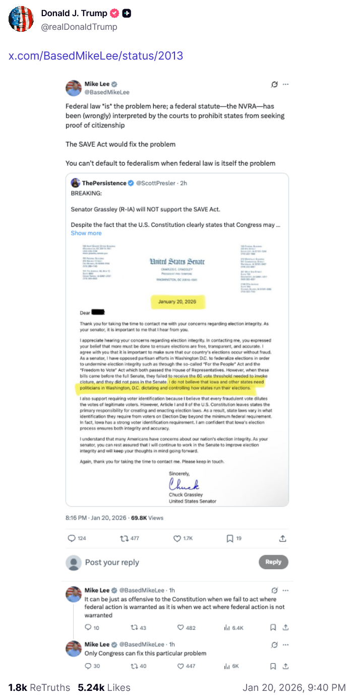https://truthsocial.com/@realDonaldTrump/posts/115930772612778456https://x.com/BasedMikeLee/status/2013782673924170231
