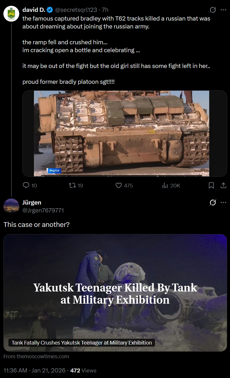 I am looking at the Russian army and their performance because I'm assessing why they are so fucking slow with the Svinorez. I try to find them being dumbdumbs so I can mock cucktin even more, that lenient pacifist daydreamer. I am looking for retardation or signs of incompetence in the Russian strategy, army and their leaders. There was massive corruption in the first 2 years that did cripple their operations, but they have become MUCH better and corrected that mistake. In my quest to understand Russia's capabilities to massacre more Banderites more quickly, I came to the conclusion that the pace is what it is because of the nature of drone warfare (which almost no one in the civilian sector understands yet), and there is no evidence for those RIDICULOUS numbers. It's literally your guy claiming something. Unless YOU have seen that video or the supercut thereof, you are being irrational and falling for the simplest form of psyop in the world: 'trust me bro'.