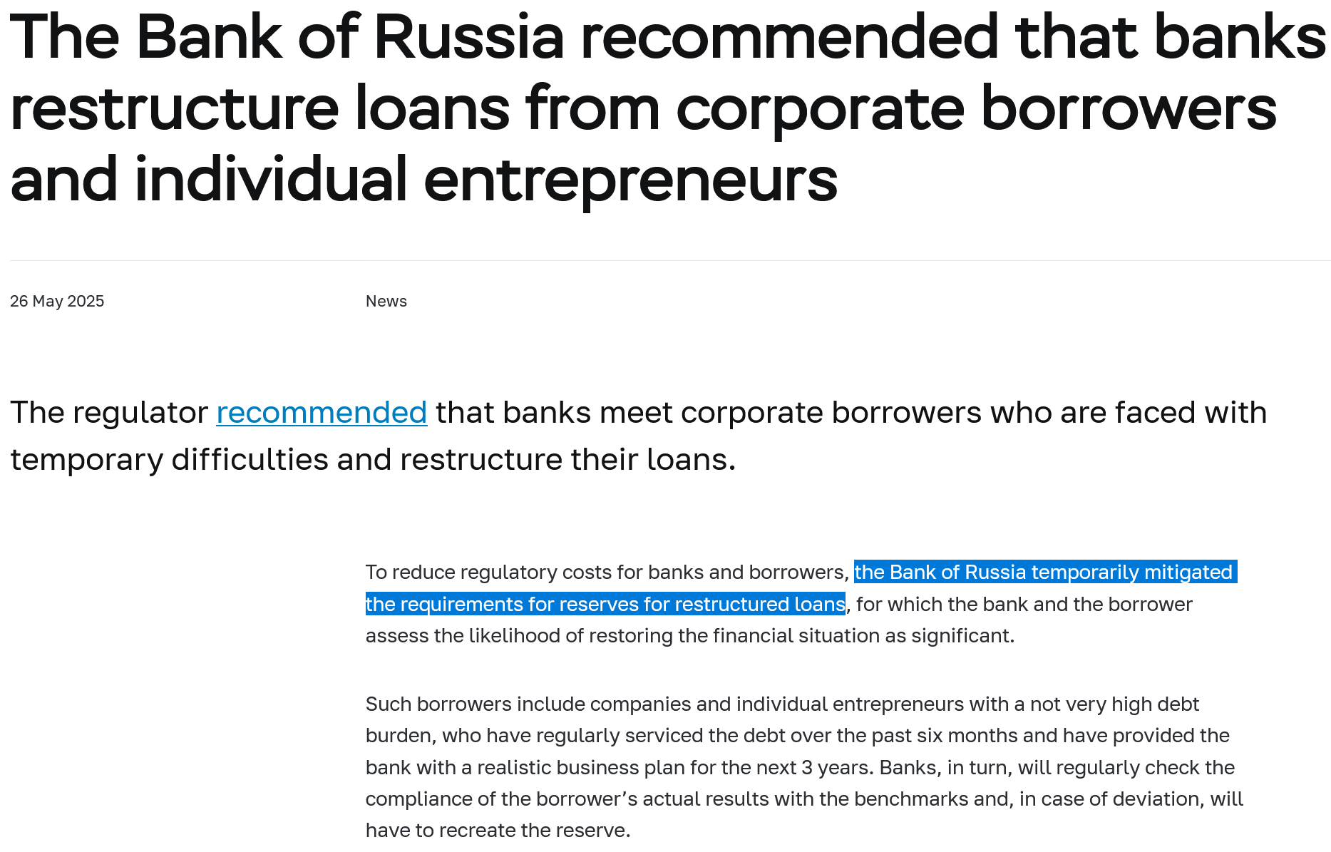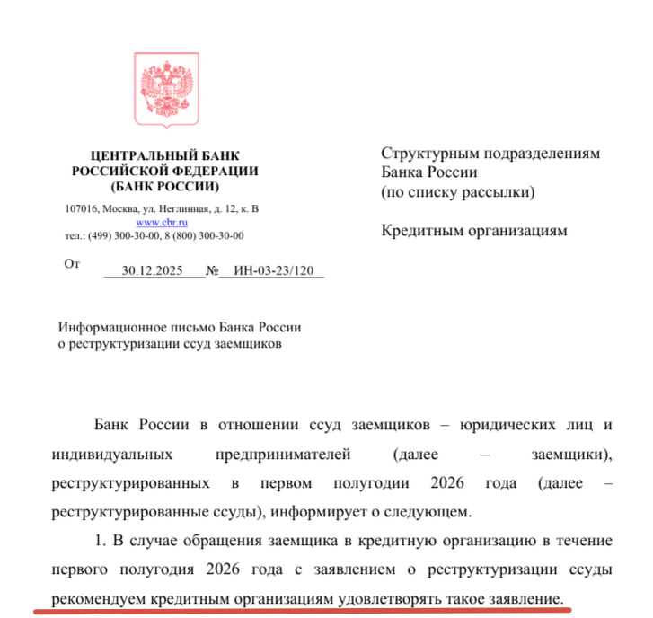 >>526573172translated textThe Bank of Russia, with respect to loans to borrowers — legal entities and individual entrepreneurs (hereinafter — borrowers) restructured in the first half of 2026 (hereinafter — restructured loans), informs as follows.In the event that a borrower applies to a credit institution during the first half of 2026 with an application for loan restructuring, we recommend that credit institutions satisfy such an application.