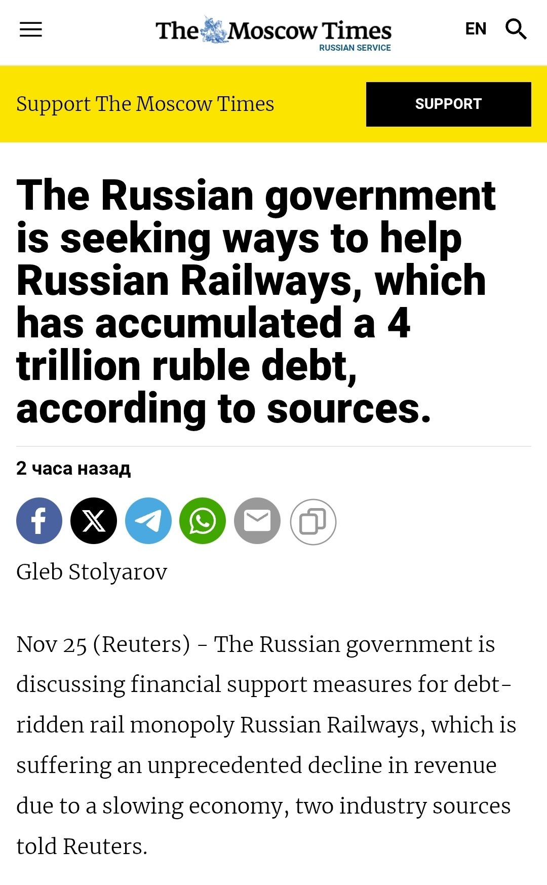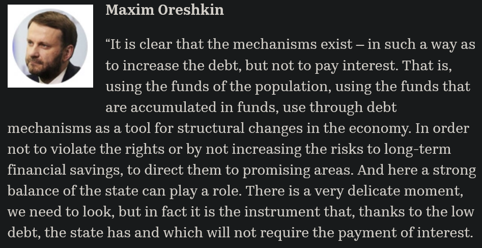 >>526575285what is your opinion on that article ?>>526573357Looks like a realistic scenario and what do you think the russian gov can do ? Lipsits is saying that confiscation of all prvate investments from the banks and move to total war economy is the only way to somehow surviveThe russian railroad corporation situation is insane, they should default i think, but it is a dead sentence to russia, the corpo owes 4 trillion rubles, and they make something like 30 mil a year