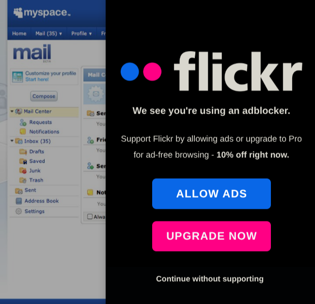 >>526602567>What really killed MySpace though was their decision to nuke themselves and delete fucking everything,My entire early 20s vanished into the ether when Myspace deleted everything. I didn't even realize until I started to wonder why the majority of all my friends pictures only go back to roughly the same time period and I realized that was when everyone moved to Facebook and most people didn't bother transferring their photos.