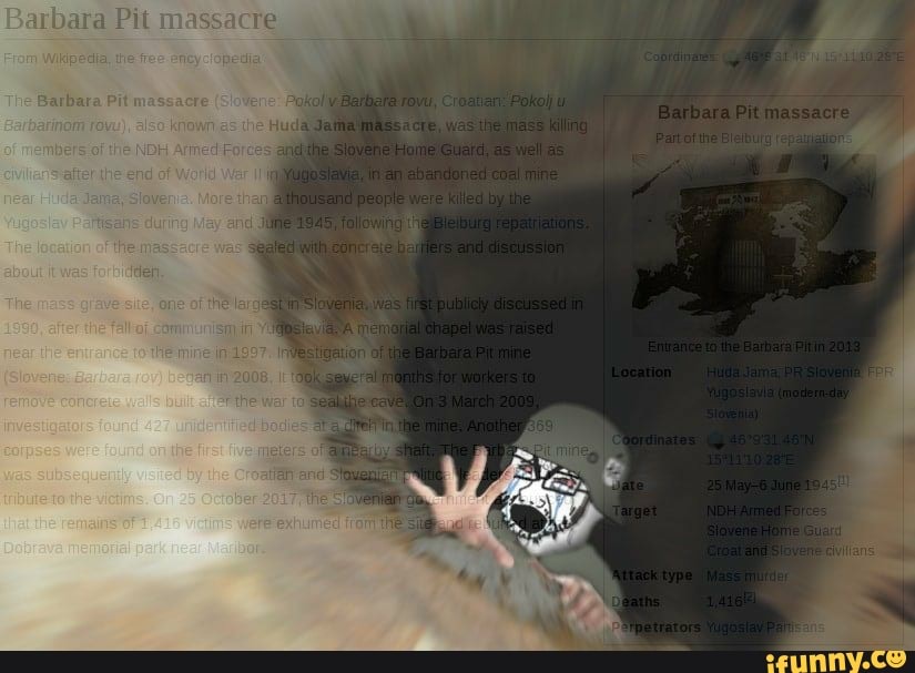 >>526607431>abandoned coal mine known as the Barbara Pit (Slovene: Barbara rov), also known as the Huda Jama Mass Grave (Grobišče Huda jama) or the Saint Barbara Abandoned Mine Shaft Mass Grave. (Grobišče v opuščenem rudniškem jašku Sv. Barbara). It is presumed the victims, the exact number of which has not been determined, were Slovene Home Guard troops, Slovene and Croatian civilians, Ustaša soldiers, and Croatian Home Guard troops executed by the Partisans