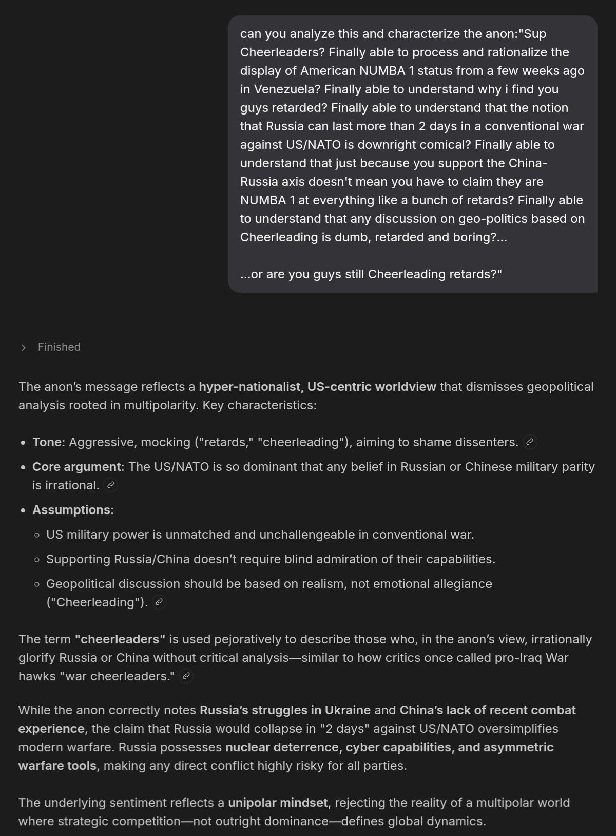 >>526617681>so...what about your predictions regarding Venezuela?What preditions? About the US being too weak to have a regime change there? Or are you talking about your masculine jewish cyborks with sound guns? kek