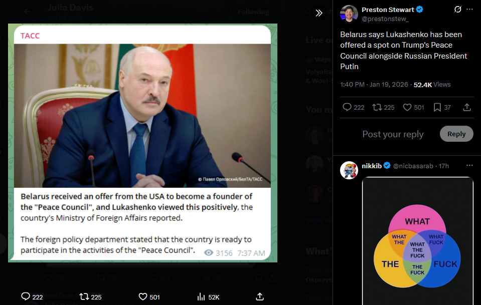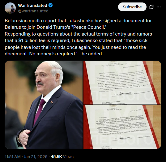 Belarusian media report that Lukashenko has signed a document for Belarus to join Donald Trump’s "Peace Council."