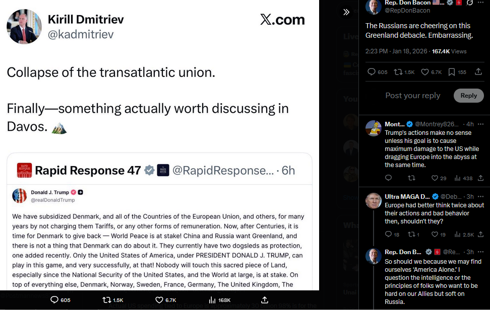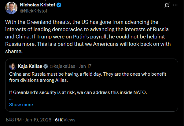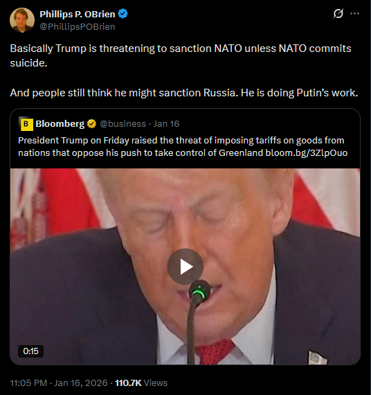 With the Greenland threats, the US has gone from advancing the interests of leading democracies to advancing the interests of Russia and China. If Trump were on Putin's payroll, he could not be helping Russia more. This is a period that we Americans will look back on with shame.