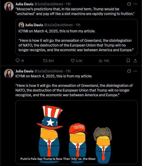 “Russia is a threat to us because of Greenland, which it has no capacity to seize and is already under NATO, but not a threat to us if they take parts of Eastern Europe, and also, let’s put Putin on our Board of Peace” is incoherent.