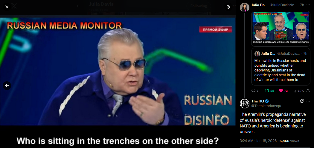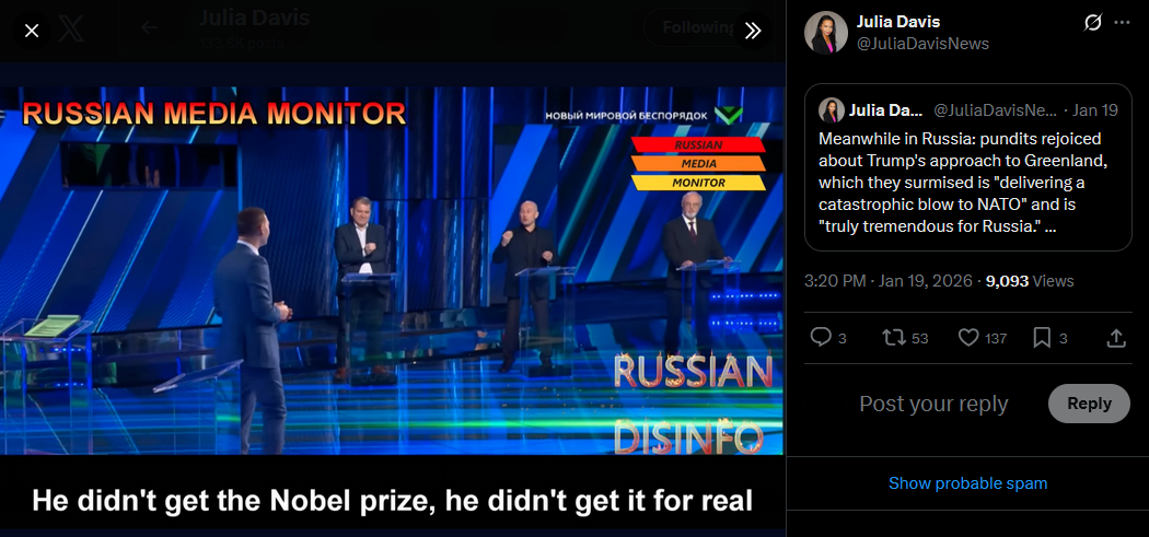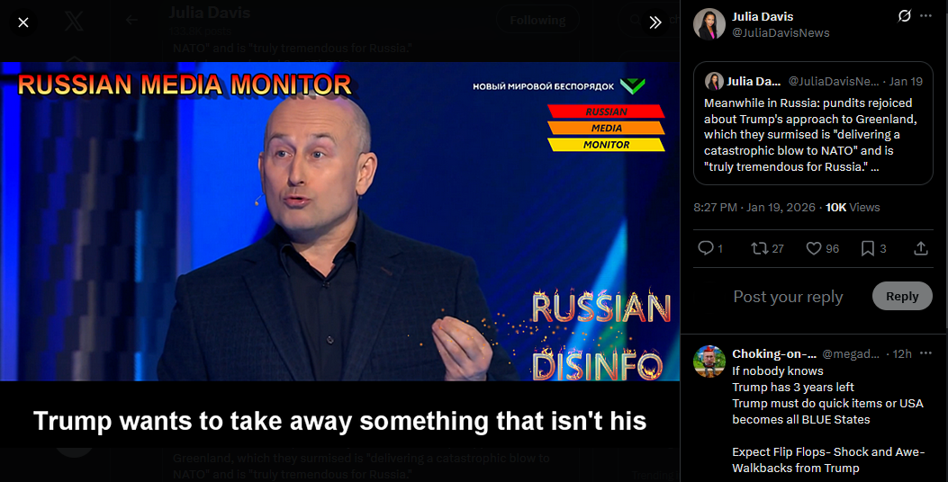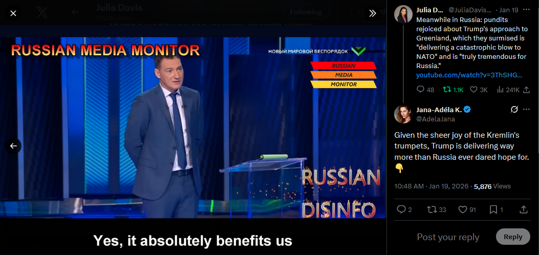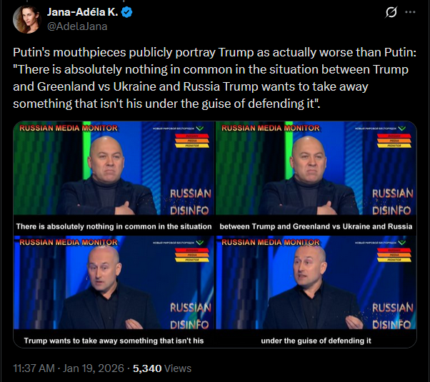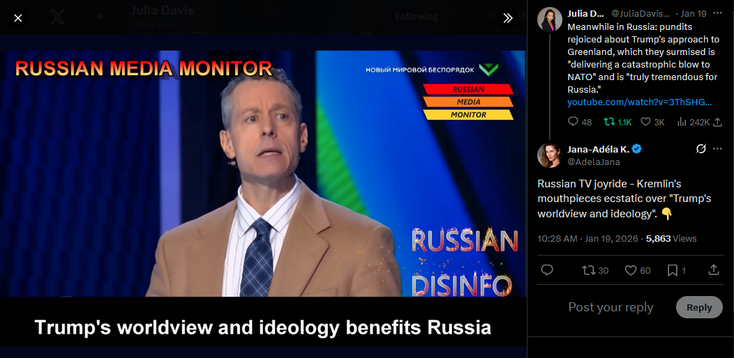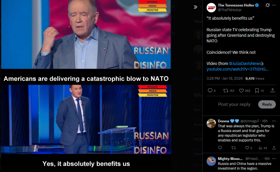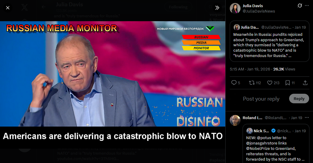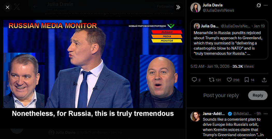 Russian state TV celebrating Trump going after Greenland and destroying NATO