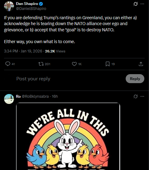 If you are defending Trump’s rantings on Greenland, you can either a) acknowledge he is tearing down the NATO alliance over ego and grievance, or b) accept that the *goal* is to destroy NATO.